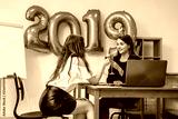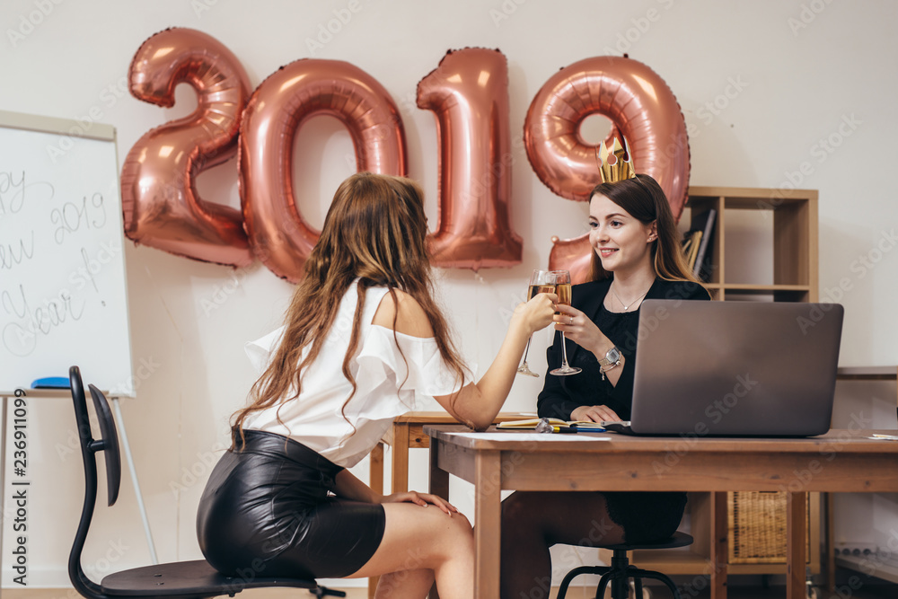 Young business women celebrating Christmas, New Year in office