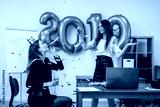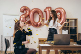 Office christmas party. Group of female colleagues having fun at new year celebration