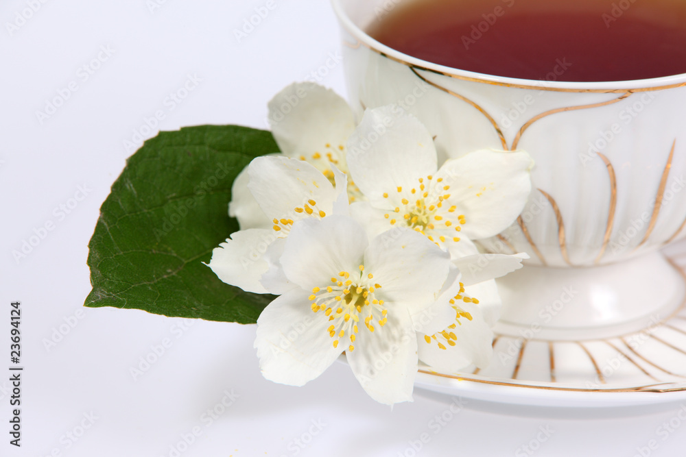 Cup of tea with jasmine flowers isolated on white.