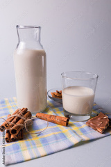Natural milk in bottles with almond nuts and cinnamon sticks on napkin , over white background.