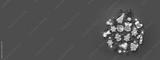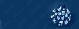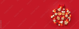 Creative Christmas ball made of iced gingerbread cookies, anise stars, berries, orange chips, decorated red ribbon bow on red background. New Year banner. Top view.