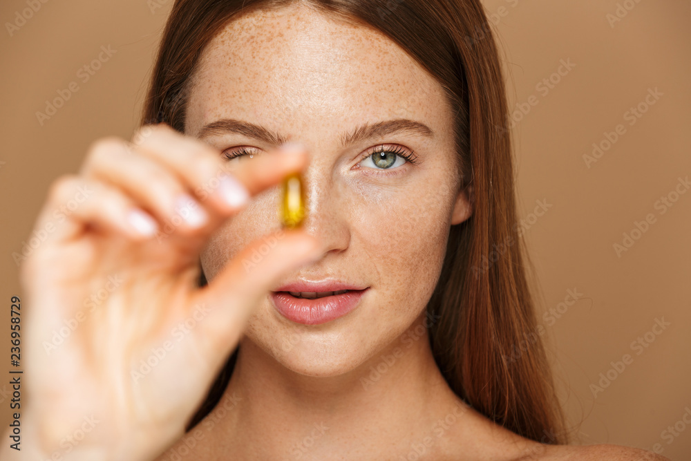 Beauty image of adorable shirtless woman 20s holding vitamin pill, isolated over beige background