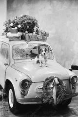 Small beagle dog sits on the hood of blue retro car with presents on the roof, decorated for Christmas and New Year holidays