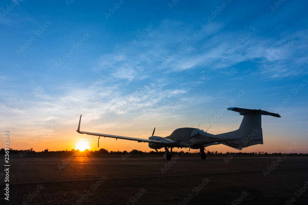 Shadow of a small landed plane on the airfield and the Beautiful sunset sky background