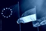 State flags of Ukraine and the Federal Republic of Germany and the flag of the European Union