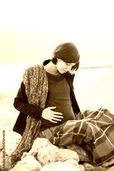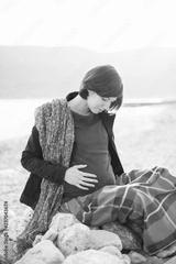 Pregnant young woman seats on sea beach and touches baby bump. Girl is enjoying sunset on coastline.