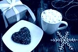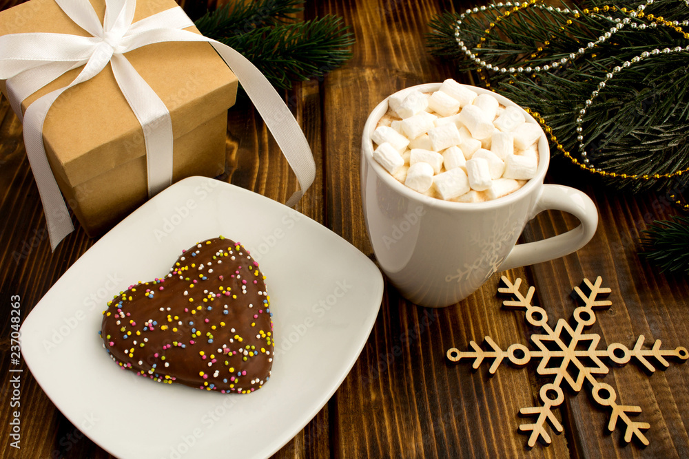 Hot chocolate with marshmallows in the white cup and Christmas composition on the brown wooden background