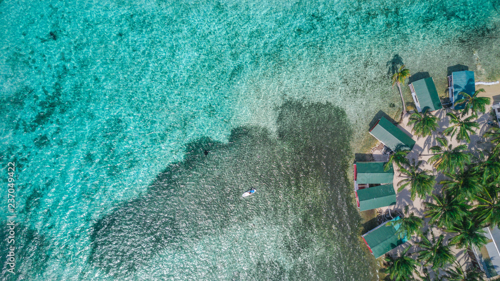 Aerial drone view of Tobacco Caye small Caribbean island with palm trees and bungalows in the Belize Barrier Reef