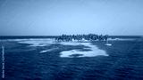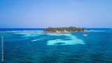 Aerial drone view of Tobacco Caye small Caribbean island with palm trees and bungalows in the Belize Barrier Reef