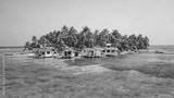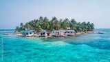 Aerial drone view of Tobacco Caye small Caribbean island with palm trees and bungalows in the Belize Barrier Reef