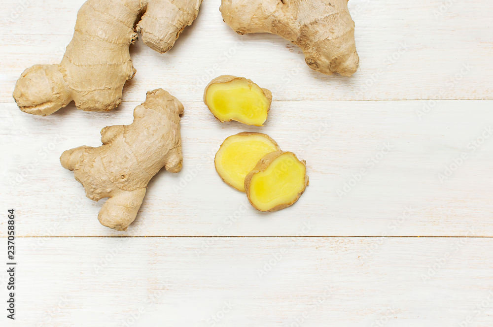 Whole and sliced fresh ginger roots on white wooden background top view copy space. Minimalistic style, seasoning, spice, ingredient for tea. Concept healthy food, medicine, improving immunity