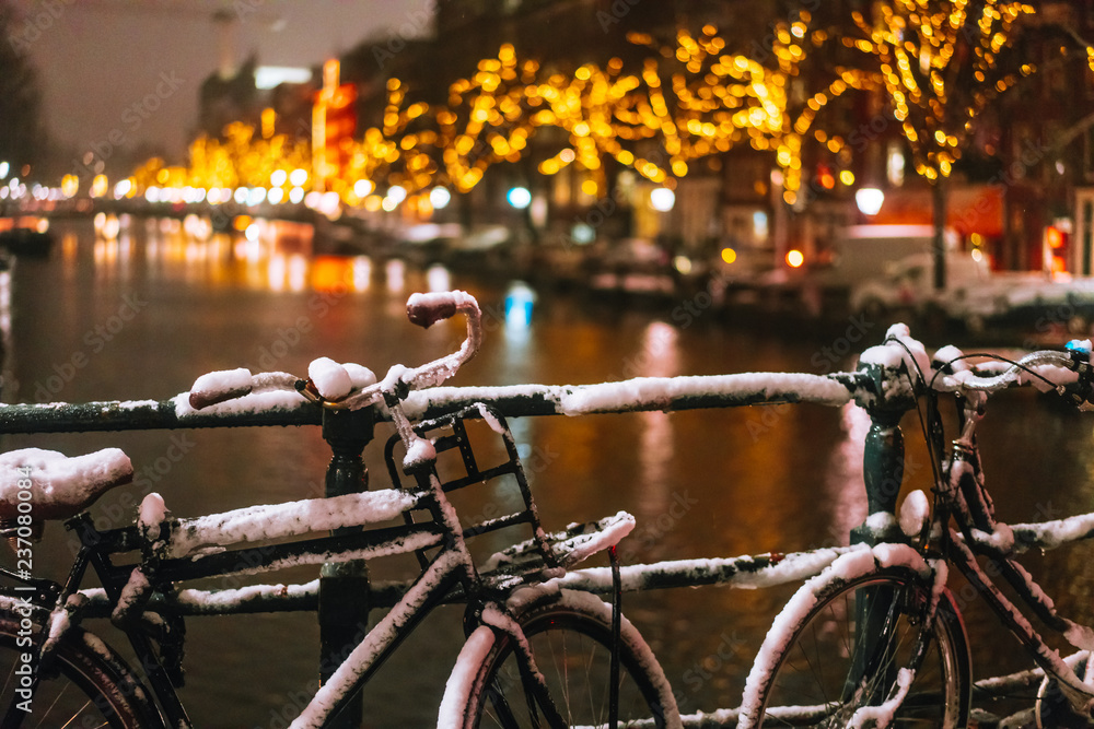Bicycles Parked Along a Bridge Over the Canals of Amsterdam