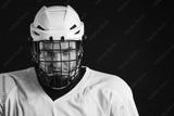 Head and shoulder portrait of confident brave hockey player in white uniform with protective helmet looking at camera, being sure in his team s victory.