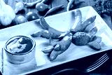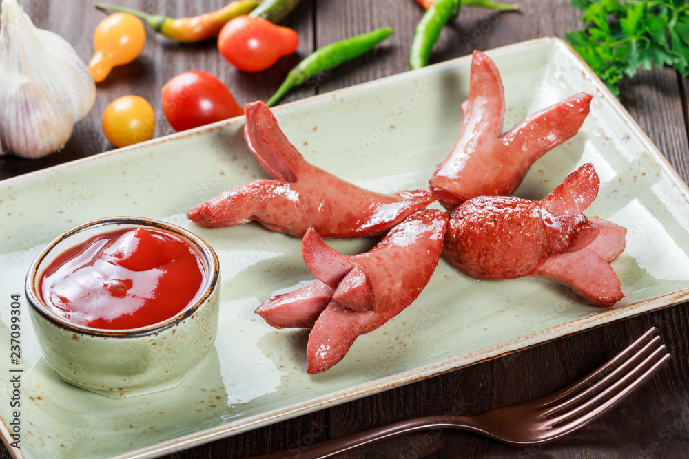 Fried sausage with sauce and fresh vegetables on dark wooden background close up. Hot and healthy food, dietary dish