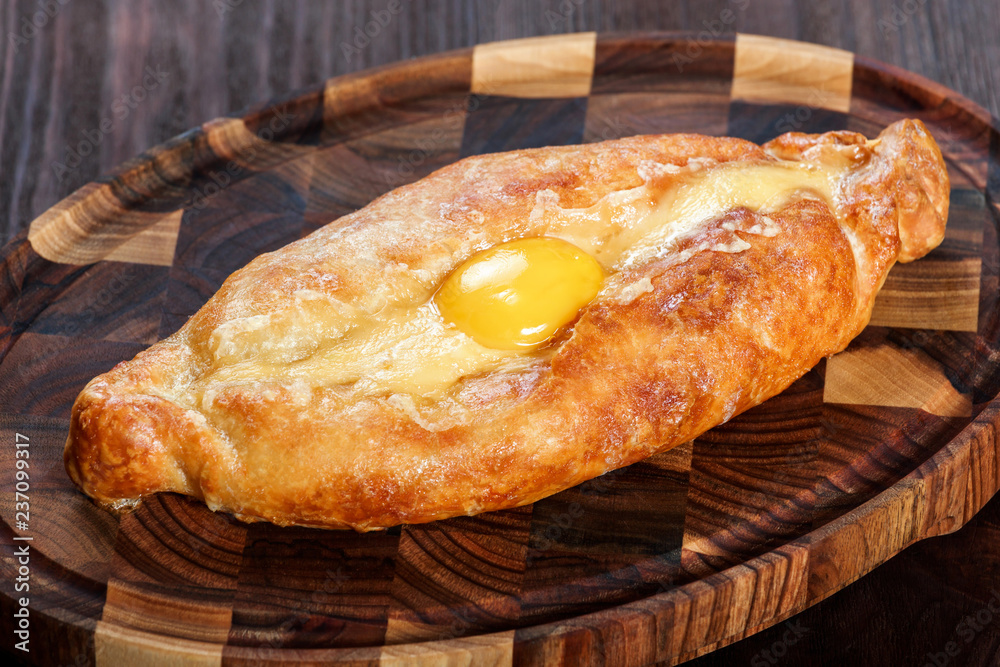 Ajarian Khachapuri traditional Georgian cheese pastry with eggs on cutting board. Homemade baking. Top view