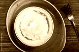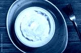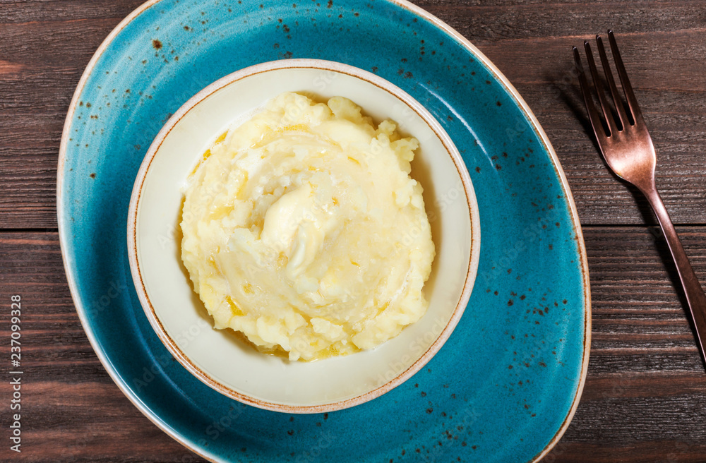 Bowl of mashed potatoes puree with butter on dark wooden background close up. Hot and healthy food, top view, flat lay
