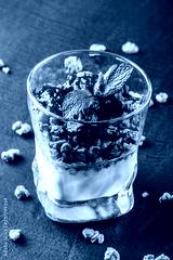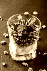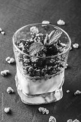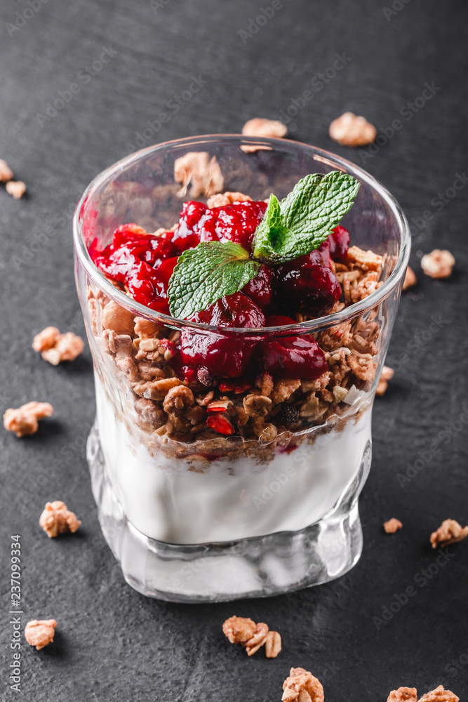 Delicious granola with yogurt and cherry in glass on black background. Healthy breakfast ingredients. Clean eating, vegan food concept. Top view