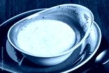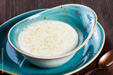 Bowl of oatmeal porridge with milk on dark wooden background close up. Hot and healthy breakfast, top view, flat lay
