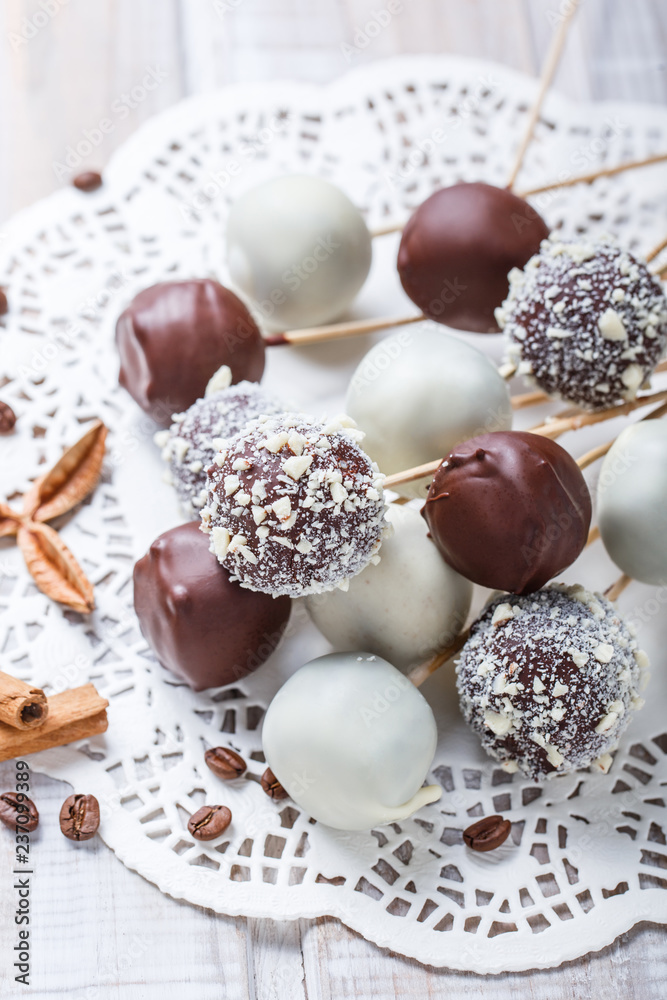 Cake pops decorated with white, dark chocolate and coconut on napkin, natural light selective focus.