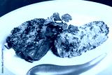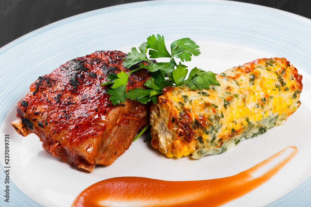 Grilled meat steak with grilled corn in cheese and greens in plate on dark wooden background. Hot Meat Dishes. Top view, flat lay