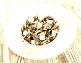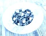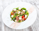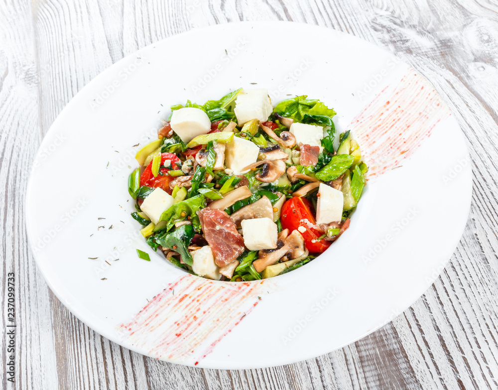Fresh vegetable salad with prosciutto, spinach, mushrooms, tomatoes, cheese, onions, cucumbers and avocado on plate on light wooden background. Healthy food. Top view
