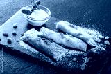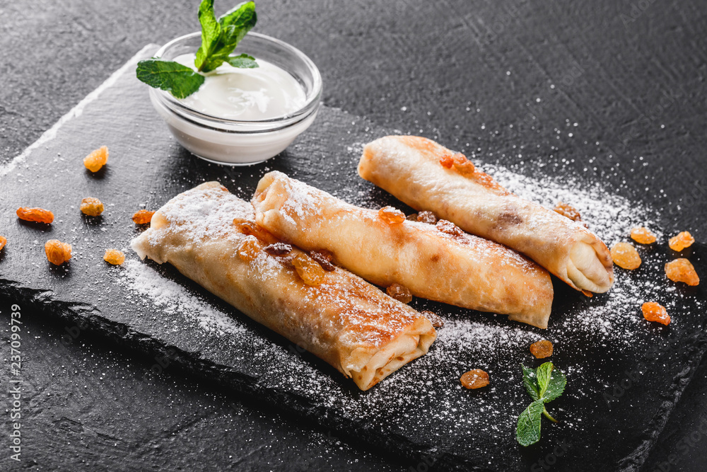 Stuffed crepes topped with tofu cheese, pesto sauce and arugula on plate. View on a dark grey stone surface. Healthy breakfast