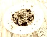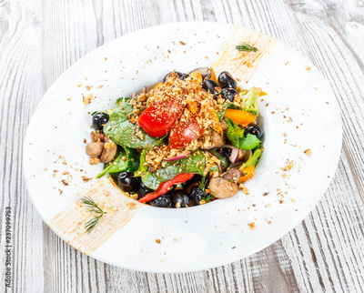 Vegetables salad with spinach, mushrooms, tomatoes, onions, cucumbers, broccoli, olives and nuts on plate on light wooden background. Healthy food. Top view