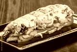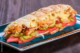 Sandwich from fresh pita bread with fillet grilled chicken, lettuce, slices of fresh tomatoes, pickles and cheese on dark wooden background. Shashlik or Shish kebab. Healthy lunch