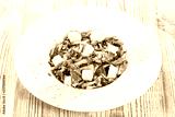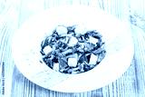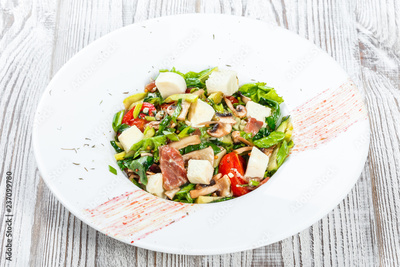 Fresh vegetable salad with prosciutto, spinach, mushrooms, tomatoes, cheese, onions, cucumbers and avocado on plate on light wooden background. Healthy food. Top view