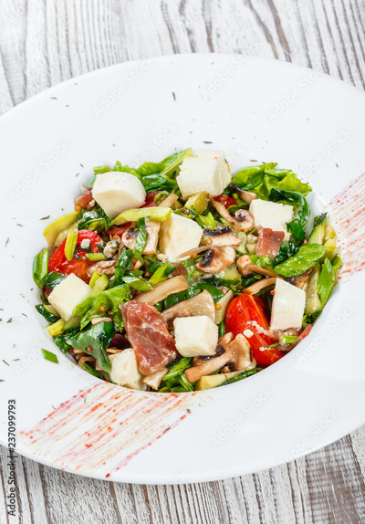 Fresh vegetable salad with prosciutto, spinach, mushrooms, tomatoes, cheese, onions, cucumbers and avocado on plate on light wooden background. Healthy food. Top view