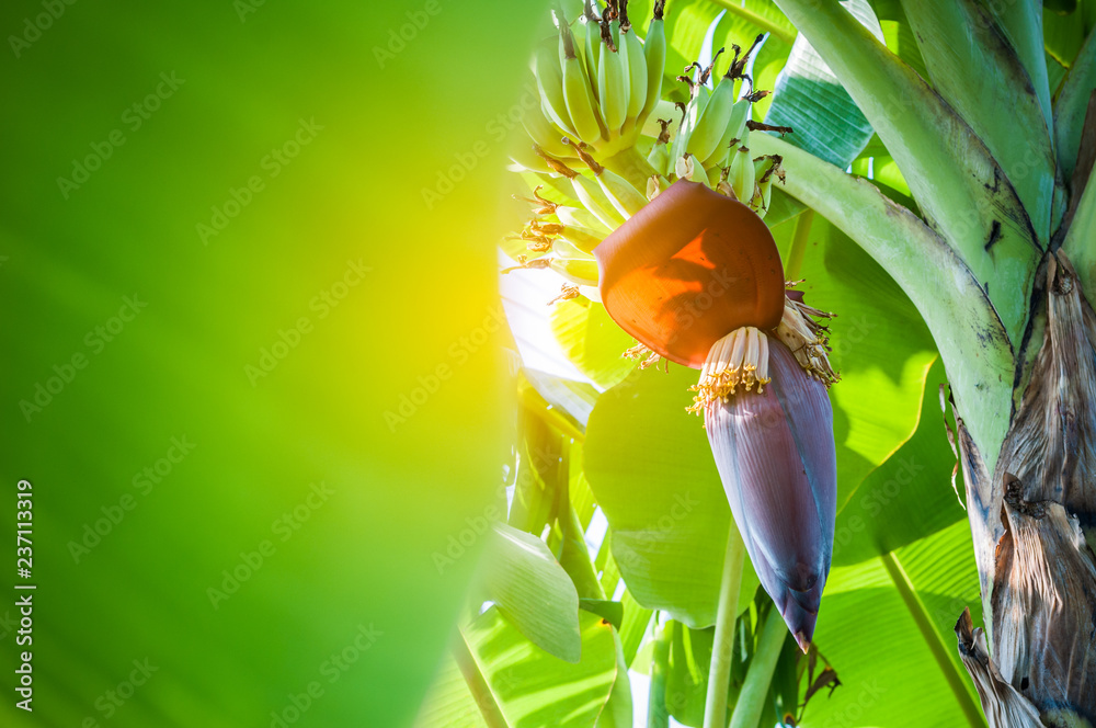Close up green raw flower blossom banana on tree garden with sunlight