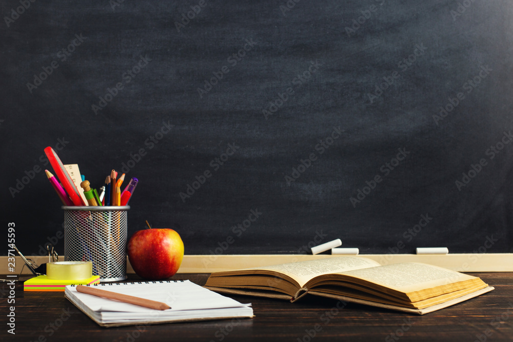 Teacher's desk with writing materials, a book and an apple, a blank for text or a background for a school theme. Copy space.