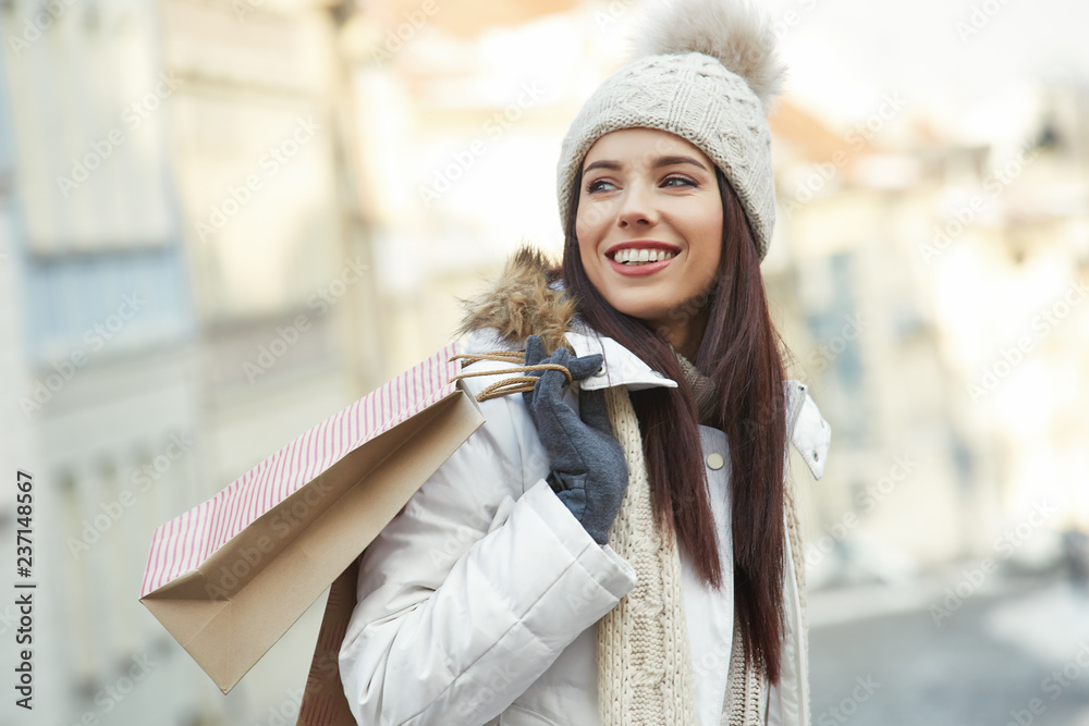 Enjoy christmas shopping. Winter shopping. Young woman with shopping bags