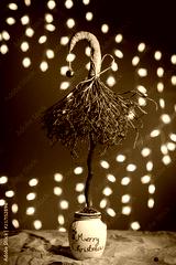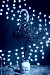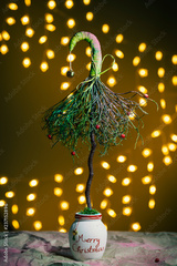 New Year's scenery. Handmade Christmas tree on the background of blurred lights of the garland