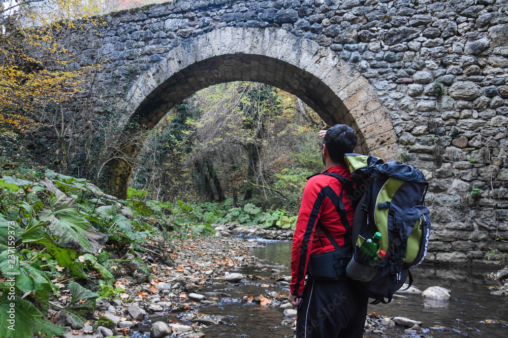 Man In a river under an old bridge. hiker in nature under a bridge in a canyon