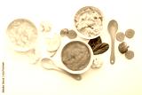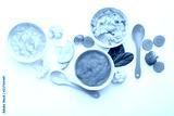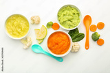 Flat lay composition with healthy baby food on white background