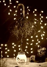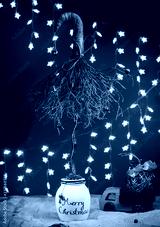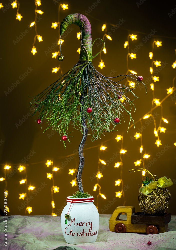 New Year's scenery. Handmade Christmas tree on the background of blurred lights of the garland