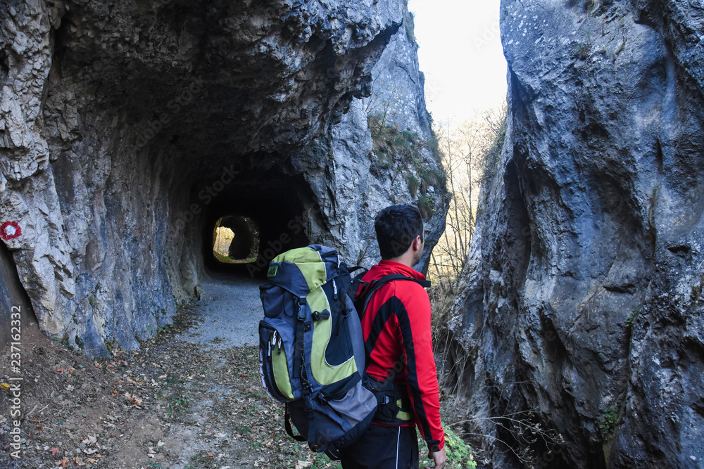 Man in front of old tunnel in a canyon Cedilka, Serbia. Traveler in autumn in a canyon, wild nature