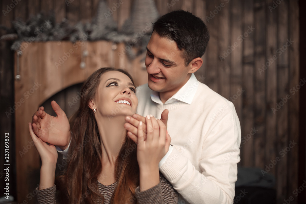 Happy Man covering woman's eyes with his hands. Surprised girl in cozy winter interior. Romantic couple portrait.