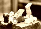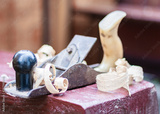 Joinery – old wooden plane and chips in a workshop of the carpenter