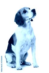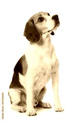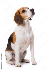 Adult beagle dog sitting isolated on white background and looking up