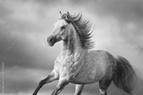 Arabian horse portrait with long mane in motion. Black and white