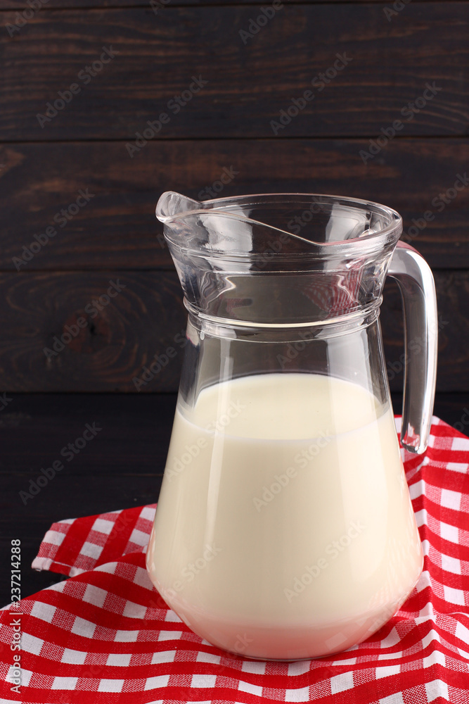 Milk in a jug on dark boards place for text copy space
