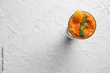 Glass of tasty orange smoothie on white table