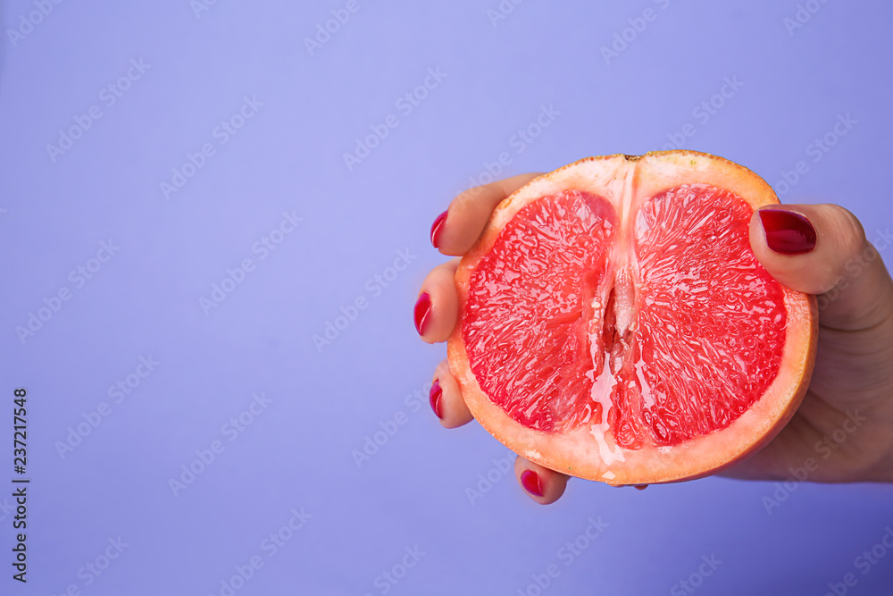 Woman holding half of juicy grapefruit on color background. Erotic concept