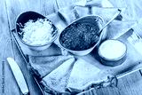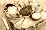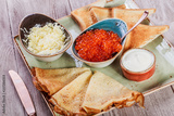 Pancakes with red caviar, butter and sour cream on plate close up. Traditional Russian cuisine at the Pancake week or Shrovetide. Flat lay. Top view