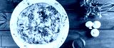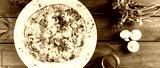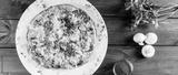Omelette with slices ham, mushrooms, greens, cheese and tomato on dark wooden background. Hot and healthy breakfast, pizza