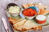 Pancakes with red caviar, butter and sour cream on plate close up. Traditional Russian cuisine at the Pancake week or Shrovetide. Flat lay. Top view