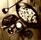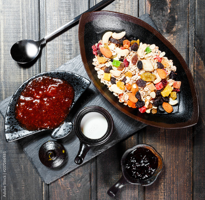 Muesli bowl with yogurt, granola, sliced banana, cashew, almonds, cranberries, nuts, dried fruits mix on dark wooden table, closeup view. Eating healthy breakfast bowl. Vegetarian food concept