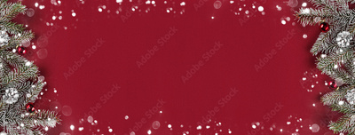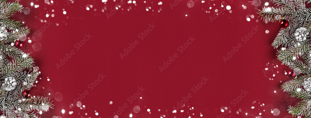 Creative layout frame made of Christmas fir branches, pine cones, gifts, red decoration on red background. Xmas and New Year theme, bokeh, glowing. Flat lay, top view, wide composition